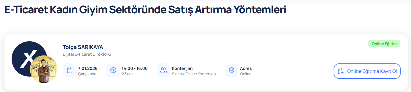 Online Eğitim Tolga SARIKAYA Dijital E-ticaret Direktörü 14.01.2026 Çarşamba 14:00 - 16:00 2 Saat Kontenjan Sınırsız Online Kontenjan Adres Online Online Eğitime Kayıt Ol - Online Operasyon Bütçe Planı Nasıl Yapılır? - Müşterinin Sipariş Oluşturma Süreci Analizi - Fiyatlandırma Stratejileri - Online İçin Satın Alma Politikamız Nasıl Olmalı? - Online’da Çok Satan Ürünlerin Özellikleri Nelerdir Ve Nasıl Bulunur? - Satın Alma Politikasının Reklam Performansına Etkisi Nedir? - Online Mağaza Fiziksel Mağaza Farkları Nelerdir?