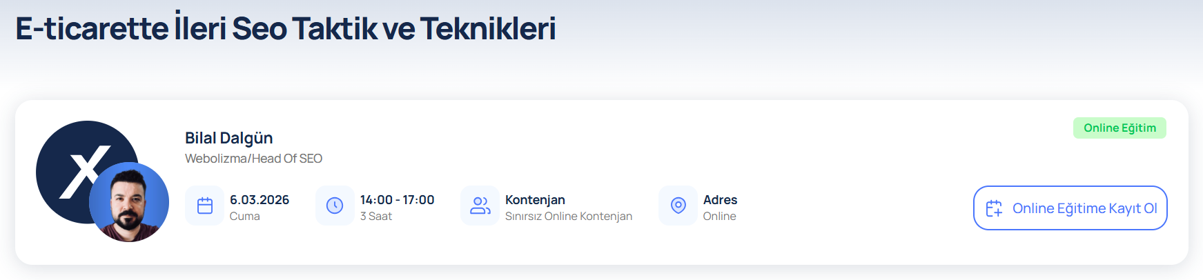 Eğitimin Amacı Buprogram, Ticimax altyapısını kullanan eticaret sitelerinin arama motorlarında görünürlüğünü artırmak, organik trafiği yükseltmek ve nihayetinde satışları çoğaltmak için gerekli olan temel ve ileri düzey SEO bilgi ve becerilerini kazandırmayı hedefler. Eğitim, teorik altyapıyı pratik uygulamalarla birleştirerek katılımcıların hemen aksiyon alabileceği bir yetkinliğe ulaşmasını amaçlamaktadır. Eğitim Yapısı Eğitim, iki ana oturumdan oluşmaktadır: Temel Seviye ve İleri Seviye. Her oturum kendi içinde "Teorik Bilgilendirme" ve "Pratik Uygulama" olarak iki bölüme ayrılmıştır. Bu yapı, katılımcıların önce kavramları anlamasını, ardından Ticimax paneli üzerinden uygulamalarını sağlar. Eğitim Akışı -E-Ticarette SEO'ya Giriş (Başlangıç Seviyesi) -Teorik Altyapı ve Strateji -Anahtar Kelime Araştırması ve Rakip Analizi -Site İçi SEO'nun Temelleri -Site Dışı SEO'ya Giriş